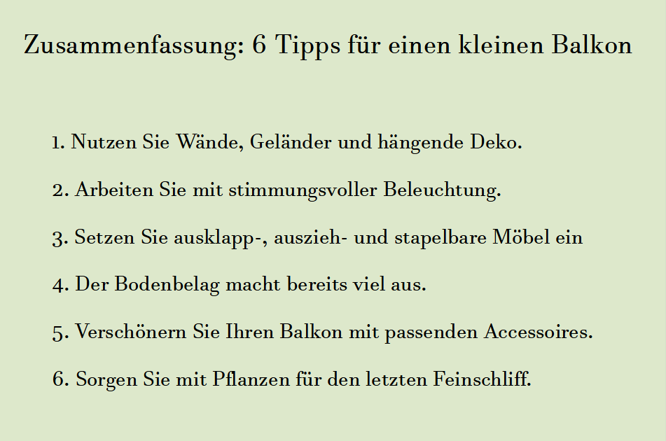 1. In die Höhe denken: Bei einem kleinen Balkon ist es ratsam, den Boden nicht zu voll zu stellen, um noch Bewegungsfreiheit zu haben. Das heißt aber nicht, dass Sie auf Pflanzen und Deko verzichten müssen. Nutzen Sie einfach Ihr Geländer, um dort Blumenkästen und Lichterketten anzubringen. An Wänden können Sie dagegen hohe und schmale Regale für zum Beispiel Töpfe und Gartenequipment sowie Hochbeete platzieren. Ein ideales Deko-Highlight sind auch Hängeampeln,