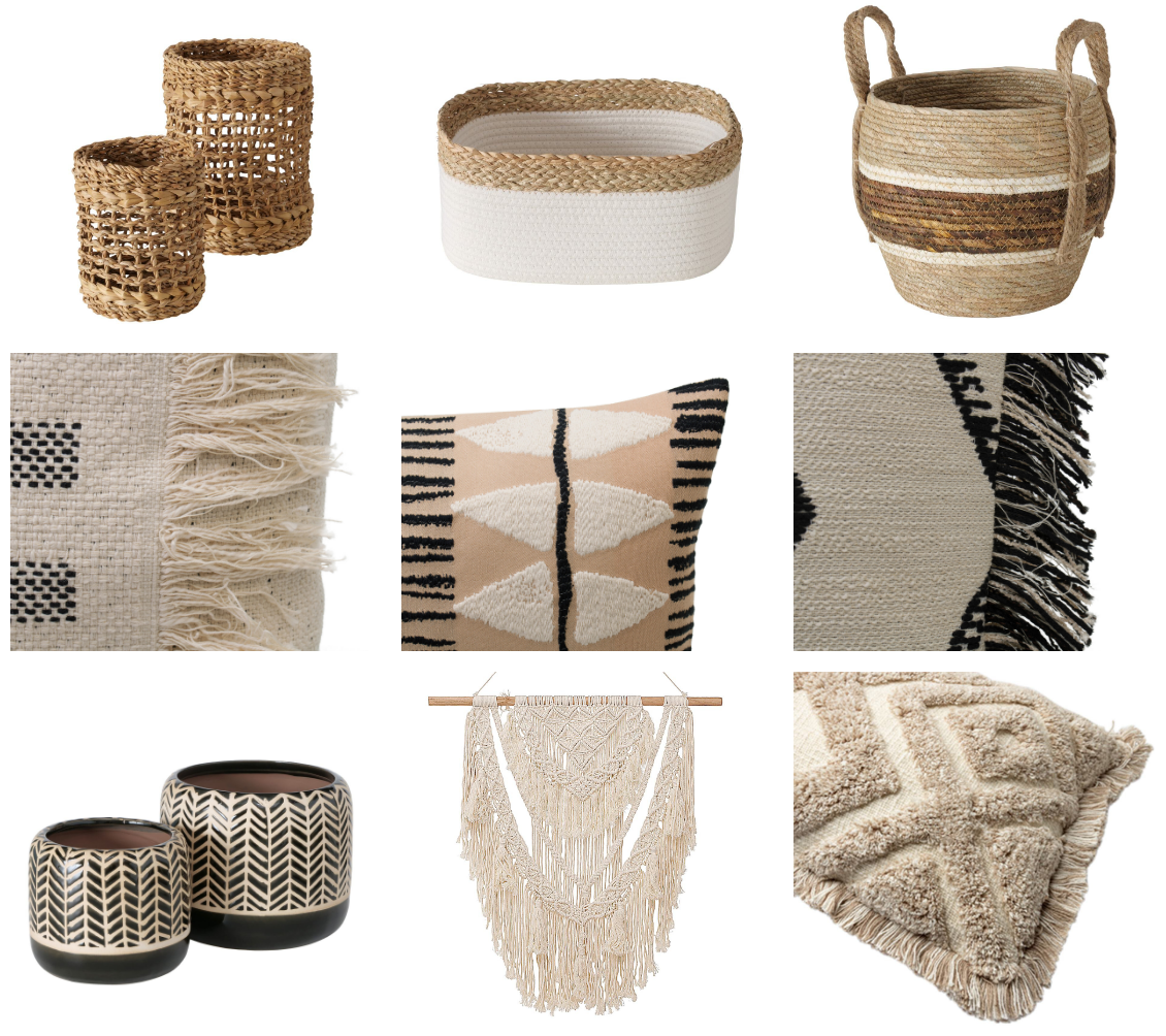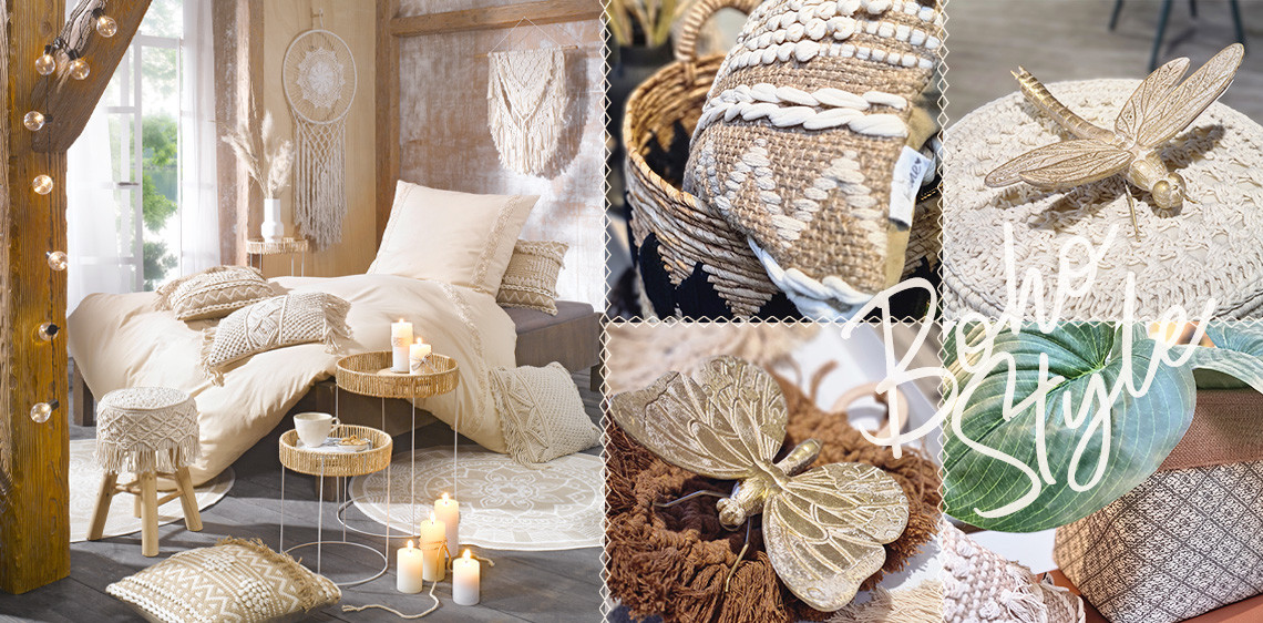 Wer Boho-Look hört, denkt meist direkt an Makramee – also eine besondere Knüpftechnik, die in Form von Wandbehang, Kissenhüllen, Tischläufern und mehr präsentiert werden kann. Der Handcraft-Look ist das, was diesen Stil besonders ausmacht. Aber Bohémien ist viel mehr als das! Ergänzend dazu könnt ihr mit vielen weiteren Deko-Elementen Boho-Charme in eure vier Wände zaubern. Körbe, Teppiche oder Kissenhüllen aus Jute sind beispielsweise in Sachen Bohemian-Style auch nicht mehr wegzudenken. Besonders mit Kissen aus verschiedenen Stoffarten, mit Quasten und Stickereien sowie kuschelweichen Plaids macht ihr es euch so richtig gemütlich. Auch Bambus oder Pflanzenfasern wie Sisal oder Bast verleihen eurem Wohnzimmer das gewisse Etwas.
