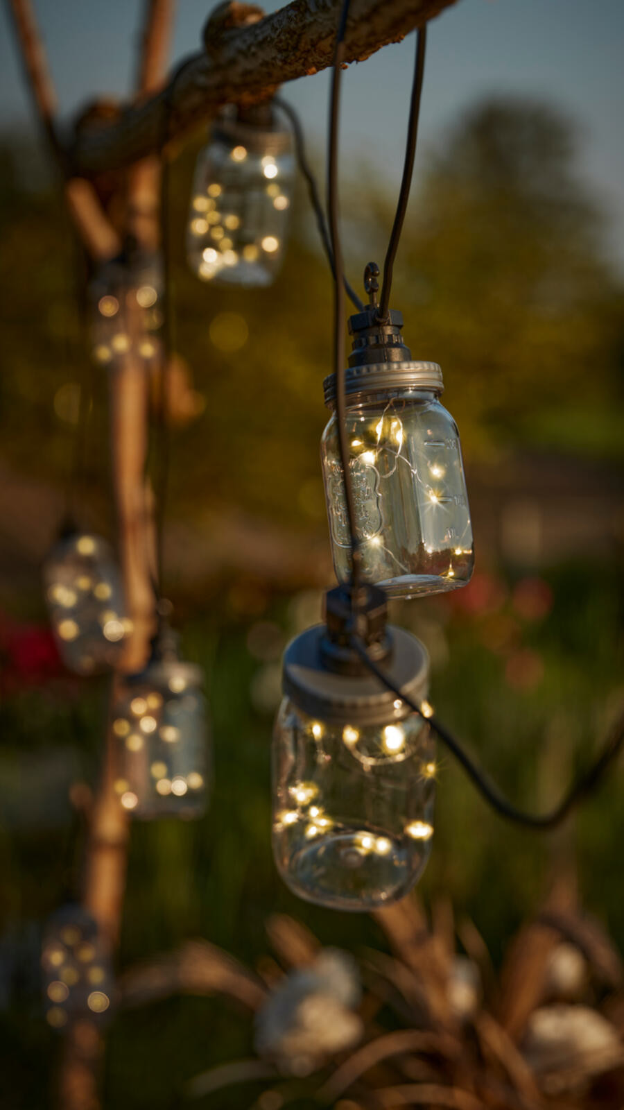 Um den Look eurer Boho-Sommerparty perfekt abzurunden, nutzt ihr am besten die Wirkung von warmem Licht. Laternen und Lichterketten lassen eure Party am Abend magisch wirken. Hinzu kommen Kerzen, die eine ganz besondere Stimmung hervorrufen. Auch Dekozweige und Pampasgras passen perfekt in das Bild einer Boho-Party.