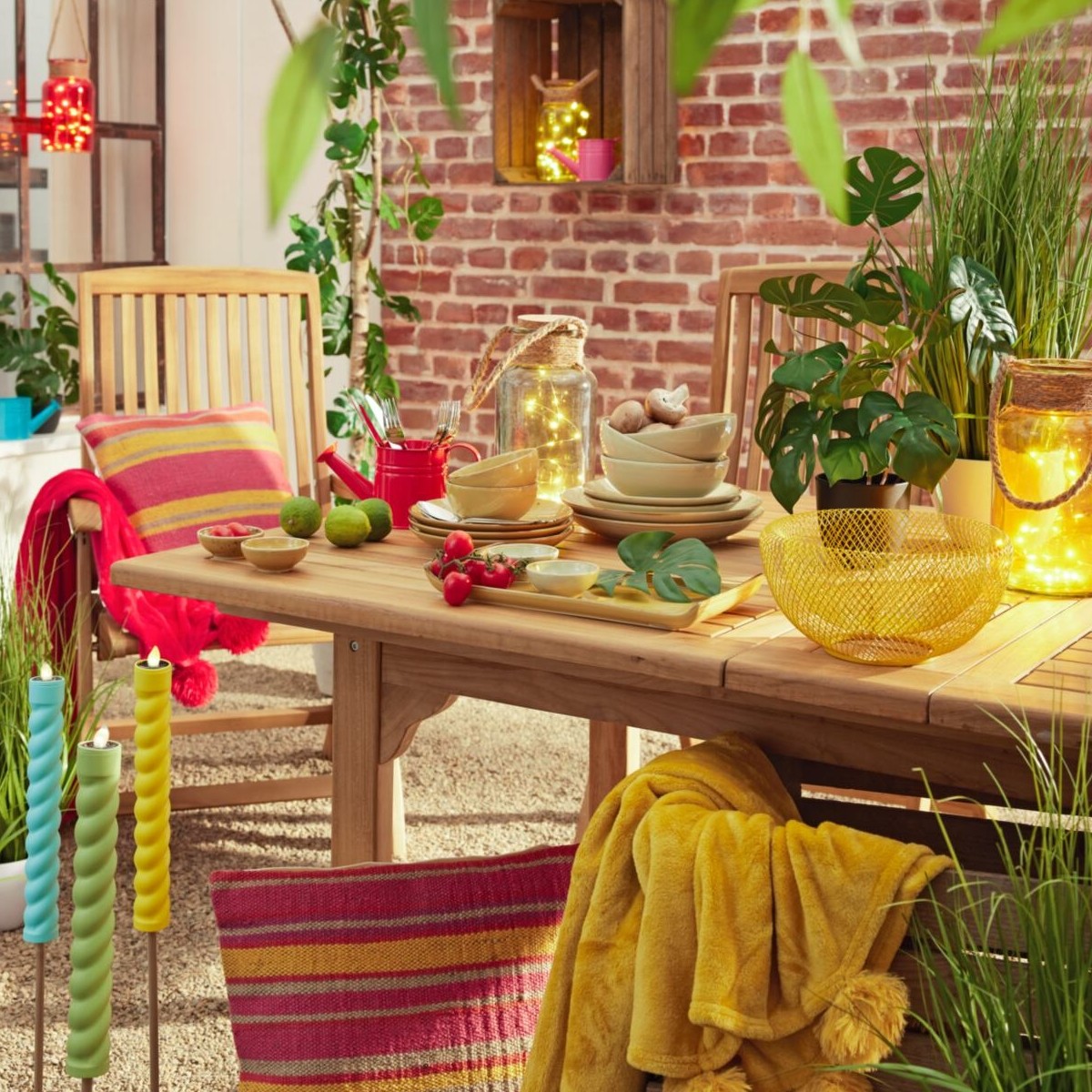 Ihr könnt nicht genug Farbe im Leben haben? Dann lasst es auch die Gäste eurer Sommerparty wissen! Mit vielen bunten Accessoires erschafft ihr eine kunterbunte Welt, in der es sich wunderbar feiern lässt. Ihr könnt schon mit wenigen knalligen Accessoires für echtes Sommerfeeling sorgen. Lasst ein strahlendes Gelb, Rot oder Grün auf euren Kissen, Decken und Sonnenschirmen erstrahlen. Macht auch vor bunten Kerzen keinen Halt.