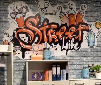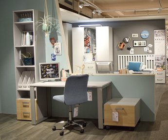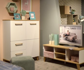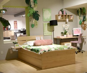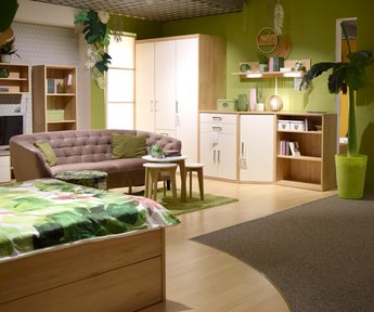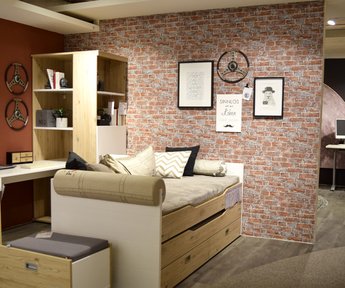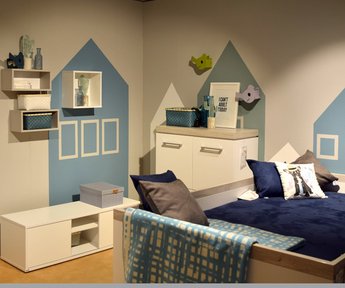 Legt am besten auch beim Einrichten von Jugendzimmern Wert auf Möbel, die mit euren Kindern „mitwachsen“, damit sie möglichst lange etwas von ihrer neuen Einrichtung haben. Mittelpunkt der Einrichtung ist ein modernes Jugendbett, idealerweise mit integrierten Schubkästen und zusätzlichem Stauraum zum Beispiel für Decken oder Kissen. Regale, Rollcontainer oder Sideboards sorgen darüber hinaus für den nötigen Platz, um Schulhefte, Bücher, Computerzubehör und persönliche Dinge optimal zu verstauen.