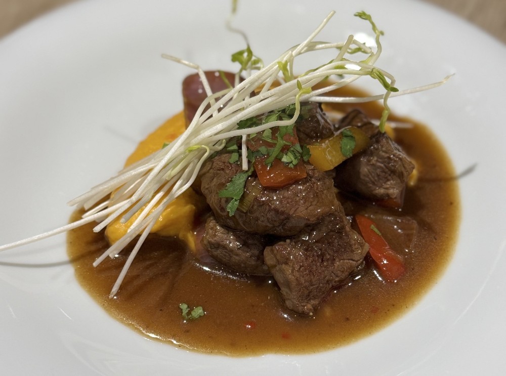 Das Rinderfilet von Fett und Sehnen befreien und in gleichmäßige kleine Stücke schneiden, beiseitestellen. Zwiebeln schälen und in Streifen schneiden. Paprika schälen und ebenfalls in Streifen schneiden. Lauchzwiebel in Ringe schneiden. Ingwer, Knoblauch und Chili feinwürfeln. Eine Pfanne oder Wok heiß werden lassen, das Fleisch nach und nach kurz anbraten, herausnehmen. Dann das Gemüse und Gewürze kurz anschwitzen, mit Sojasauce und Rindbrühe ablöschen kurz reduzieren lassen und mit Speisestärke abbinden Fleisch und Koriander beigeben und abschmecken.