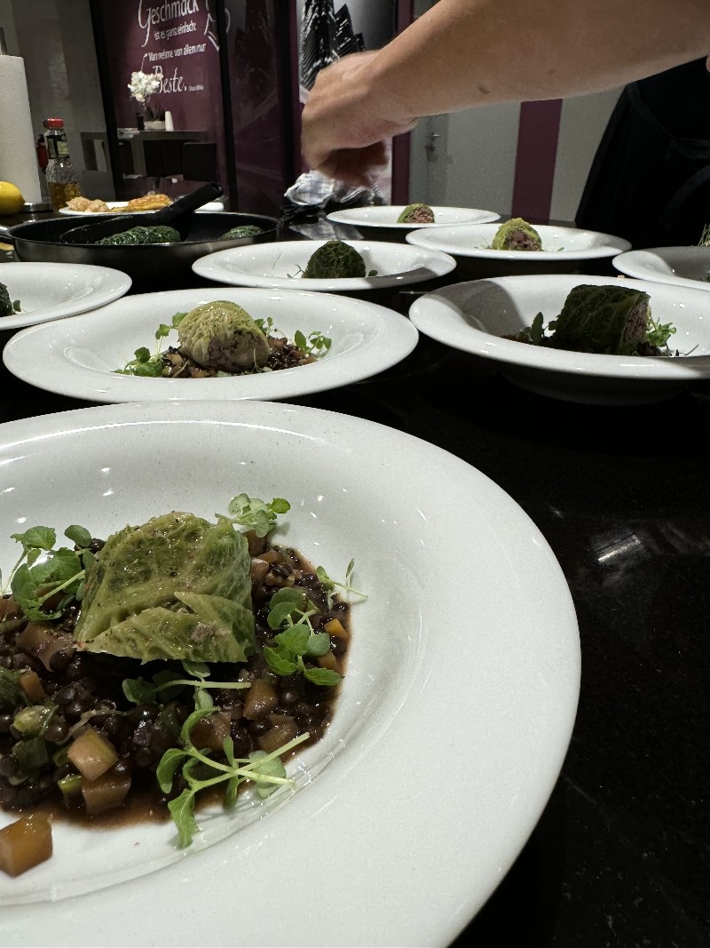 Klassische Gerichte, kombiniert mit den Einflüssen der heutigen Zeit, sorgen für neue Genusserlebnisse. Am 16. Oktober sind bei unserem Kochevent "Klassische Gerichte modern interpretiert" in unserer Kochschule bekannte Kulinarik-Klassiker in neuem Stil entstanden. Unter Anleitung von Koch Florian Trippe haben die Teilnehmer unter anderem leckere Wirsingrouladen und Kalbsfilet im Baconmantel gezaubert.