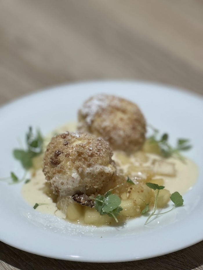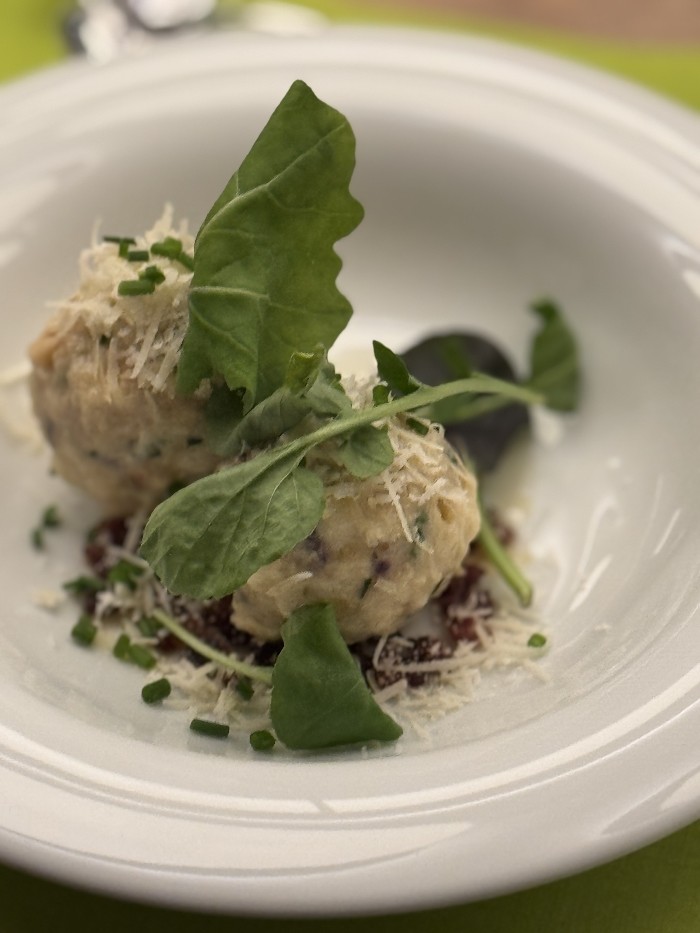Brot in gleichmäßige Würfel schneiden. Zwiebeln schälen, in feine Würfel schneiden und in Butter dünsten. Käse in kleine Würfel schneiden und mit den Zwiebeln zum Brot geben. Eier trennen. Eigelbe, Milch und Gewürze verrühren und zum Brot geben. Das Eiweiß steifschlagen und auch unter die Masse heben. 10-20 Minuten ruhen lassen. Mit nassen Händen gleichmäßige Nocken formen. Salzwasser in einem Topf erhitzen, die Nocken in das siedende Wasser geben und ca. 15 Minuten gar ziehen lassen. Braune Butter herstellen. Zum Anrichten, Nocken auf einen Teller setzen und die Braune Butter übergießen. Mit frisch geriebenem Parmesan bestreuen, Speck anlegen und mit Schnittlauch, Feldsalat, Zitronenschale und Parmesan garnieren.