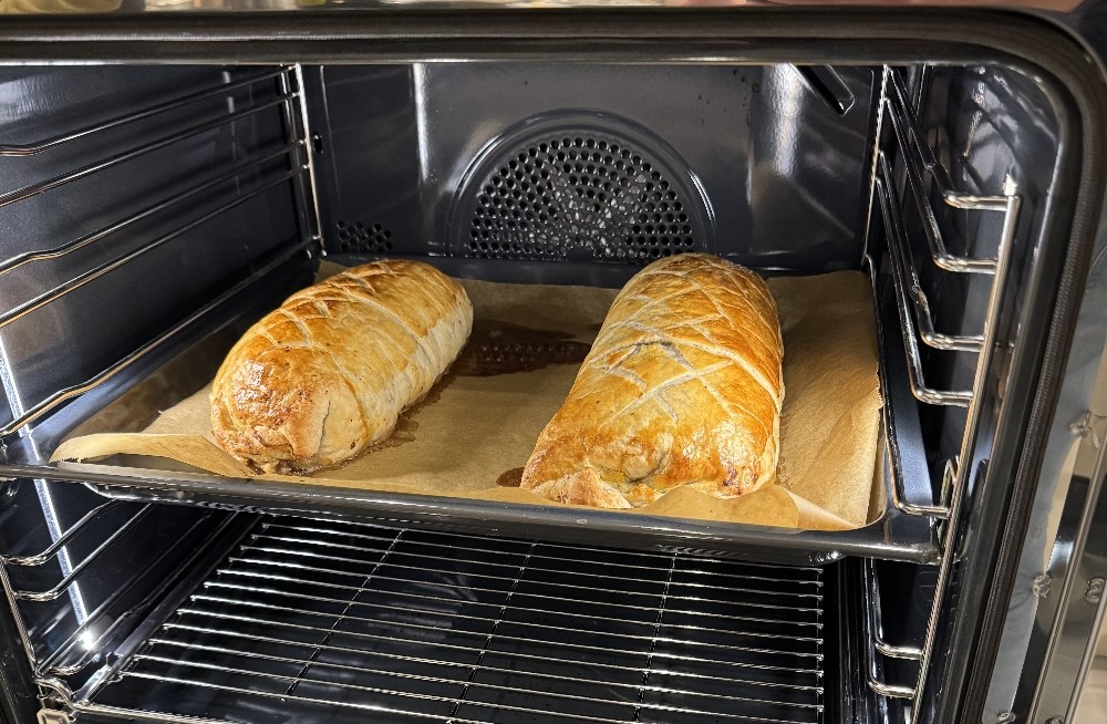 Rinderfilet salzen und pfeffern. Butterschmalz schmelzen, darin das Rinderfilet rundherum anbraten und abkühlen lassen. Champignons und Schalotten in der Butter braten. Mit der gehackten Petersilie und Senf würzen. Die Farce abkühlen lassen. Blätterteig auftauen lassen und auf dem Mehl 3 mm dünn ausrollen. Mit dünnen Scheiben rohem Schinken belegen und mit der Hälfte der Farce bestreichen. Das Filet darauflegen, mit der restlichen Farce bestreichen und den anderen Schinkenscheiben belegen. Den Blätterteig auf einer Seite über das Fleisch klappen. Die Kante mit verquirltem Eigelb bestreichen. Die andere Blätterteighälfte darüber klappen und festdrücken. Die Enden fest zusammendrücken. Aus den Teigresten Verzierungen schneiden und mit Eigelb aufkleben. Das Paket mit Eigelb bestreichen. Im vorgeheizten Ofen 25 Minuten bei 220 Grad (Gas 3-4, Umluft 200 Grad) backen. 10 Minuten ruhen lassen, dann erst mit einem Sägemesser aufschneiden.