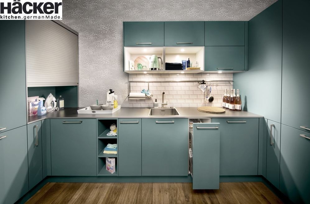 Dennoch kannst du mit flachen, offenen Regalsystemen arbeiten, um den Look des Raumes etwas zu variieren und ihm Luft zu geben. Achte jedoch darauf, dass du noch genug Bewegungsfreiheit hast, um dich bequem bewegen zu können. Wie bereits genannt, kannst du auch mit ausziehbaren Tischflächen arbeiten, die in die Unterschränke integriert sind. So steht dir bei Bedarf eine Arbeitsplatte zur Verfügung. Auch die Farbe des Hauswirtschaftsraums macht bereits viel aus. Helle Wände und Möbel lassen den Raum größer und freundlicher wirken.