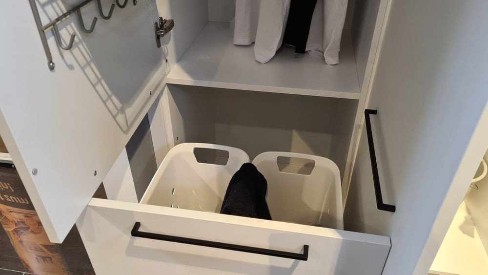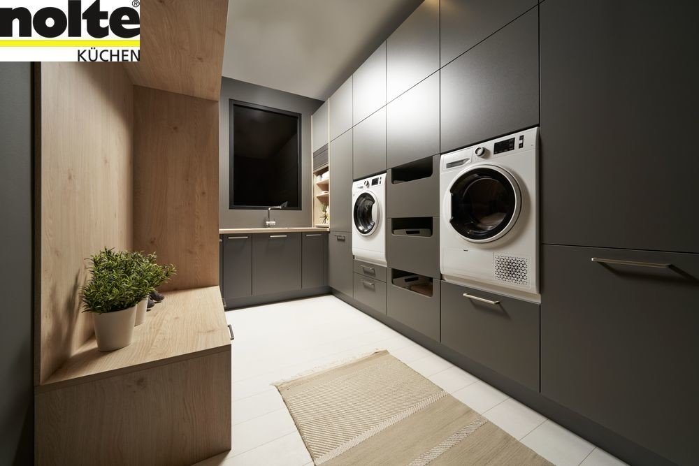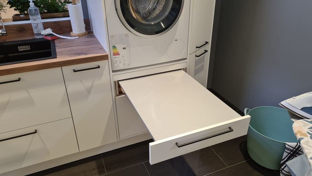 Achte ebenfalls darauf, eine Arbeitsplatte zu integrieren, auf der sich beispielsweise ideal Wäsche falten lässt. Ist der Platz für eine Arbeitsplatte nicht gegeben, kannst du stattdessen einen Unterschrank mit einer ausziehbaren Tischfläche aus dem Schubfach einbauen. So schaffst du eine zusätzliche Fläche, die je nach Bedarf im Handumdrehen geschaffen wird.