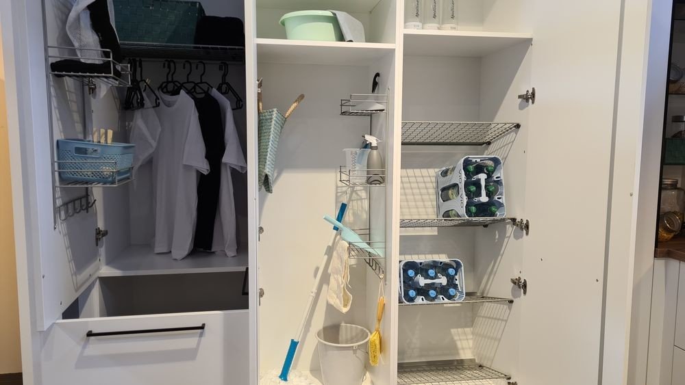 Zu guter Letzt eignet sich der Hauswirtschaftsraum auch wunderbar, um Schuhe und Kleidung darin aufzubewahren. Deine Schuhe kannst du ordentlich in einem Schuhschrank verstauen, während in einem Garderobenschrank – idealerweise mit Kleiderstange – je nach Jahreszeit die Sommer- oder Winterkleidung untergebracht ist.