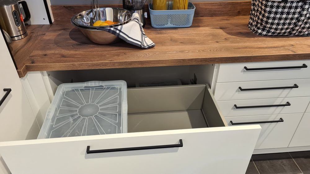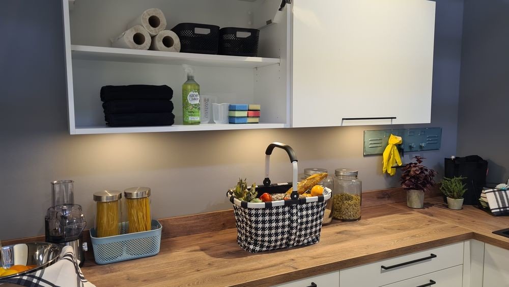 Im Unterschrank perfekt unterbringen lässt sich außerdem ein Abfalltrennsystem mit herausnehmbaren Körben oder Tragetaschen. Der Müll ist so bestens vor Besucherblicken geschützt, kann gleichzeitig ordnungsgemäß getrennt und somit ordentlich entsorgt werden.