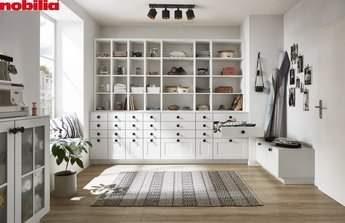 Zunächst steht das Grundgerüst auf dem Plan: Mache dir Gedanken über die passenden Hauswirtschaftsraum-Möbel, die eine praktische Basis für diesen Raum schaffen. Dabei ist eine Kombination aus offenen Regalsystemen und geschlossenen Schränken von Vorteil. So hast du den Blick auf das Wesentliche und sorgst gleichzeitig für ein ordentliches Erscheinungsbild. Besonders deckenhohe Hochschränke bieten jede Menge Platz. Darin können vor allem sperrige Teile wie Staubsauger, Besen oder Wischmopp gelagert werden.