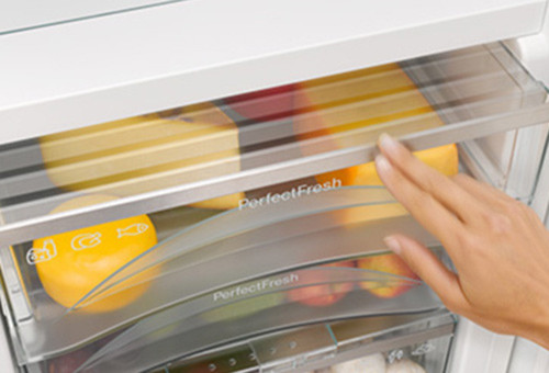 Daher bietet sich sich die oberste Ablage für haltbare Lebensmittel wie Saucen oder Marmeladen an. Milchprodukte gehören in den mittleren Bereich. Auch die Türfächer sind eher warm, eignen sich aber gut zur Aufbewahrung von Butter, Eiern und Getränken. In das unterste Fach über den Gemüseschubladen gehören die Lebensmittel, die am schnellstens verderben. Hier sind Fleisch, Wurst und Fisch optimal aufgehoben. Im unteren Bereich des Kühlschrankes herrscht die niedrigste Temperatur. Auch ist die Luftfeuchtigkeit so abgestimmt, dass Vitamine möglichst lange erhalten bleiben. Hochwertige Kühlschrank-Modelle bieten einen separaten Bereich an, in dem die Temperatur nur leicht über 0 Grad Celsius und die Luftfeuchtigkeit gesteuert werden kann. Obst, Gemüse aber auch Fleisch kann so dreimal länger aufbewahrt werden als in einem herkömmlichen Kühlschrank. Dieser Luxus verbirgt sich hinter Schlagwörtern wie z.B.: "biofresh" "longfresh" oder "vitafresh".