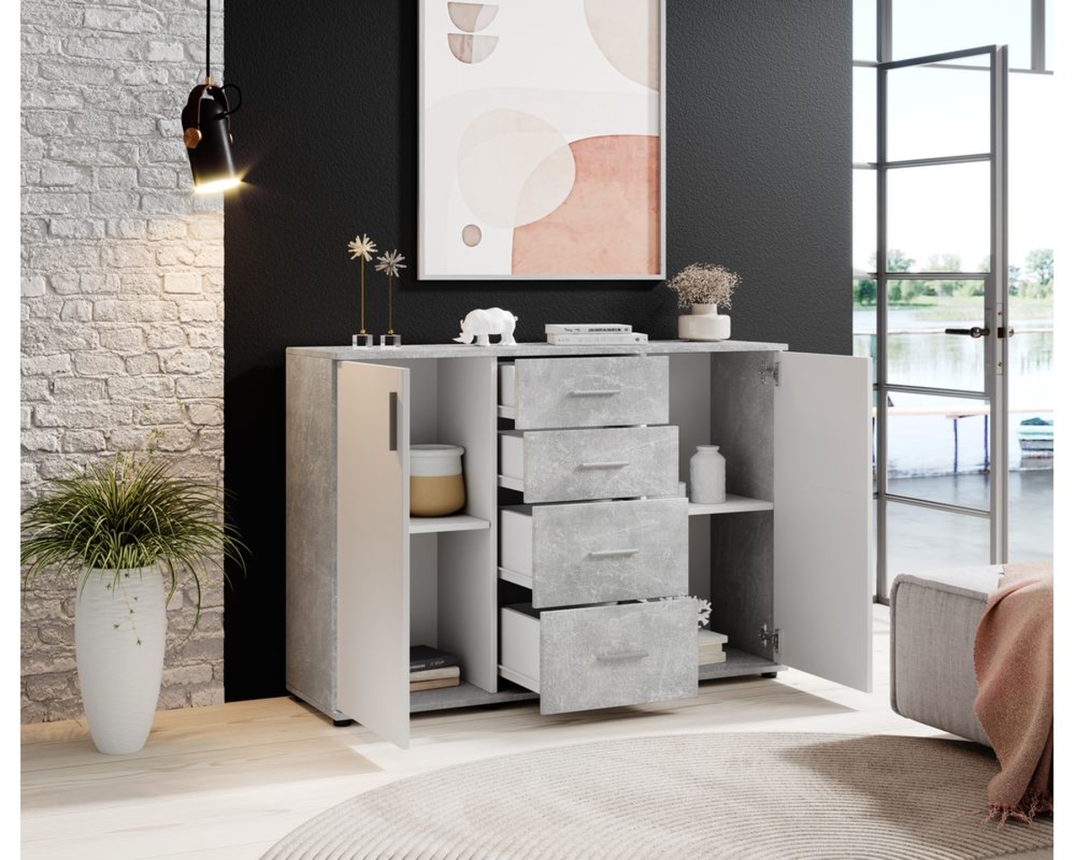 Praktisch aufgeteilt in 4 Schubkästen und 2 Türen.