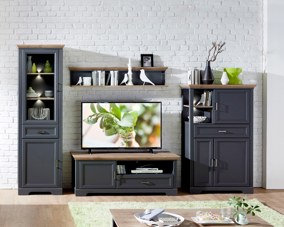 Praktischer Stauraum entsteht mit den durchdachten Stauraumelementen, Platz für die Heimkino-Ausstattung ist im TV-Unterteil reichlich vorhanden. Ebenso finden Sie offene Elemente die für ein luftiges Erscheinungsbild der Anbauwand sorgen.