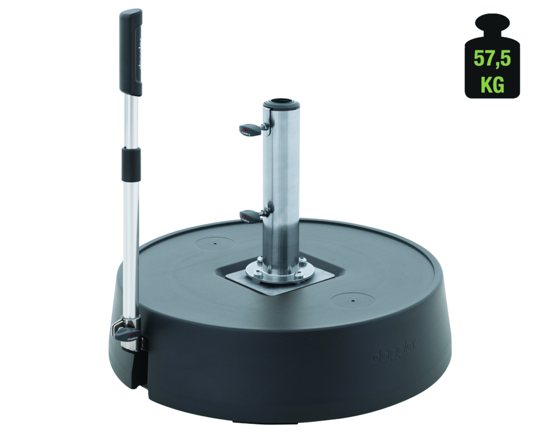 Dieser praktische Schirmständer lässt sich mithilfe einer Zugstange leicht von einem Ort zum anderen verschieben.
