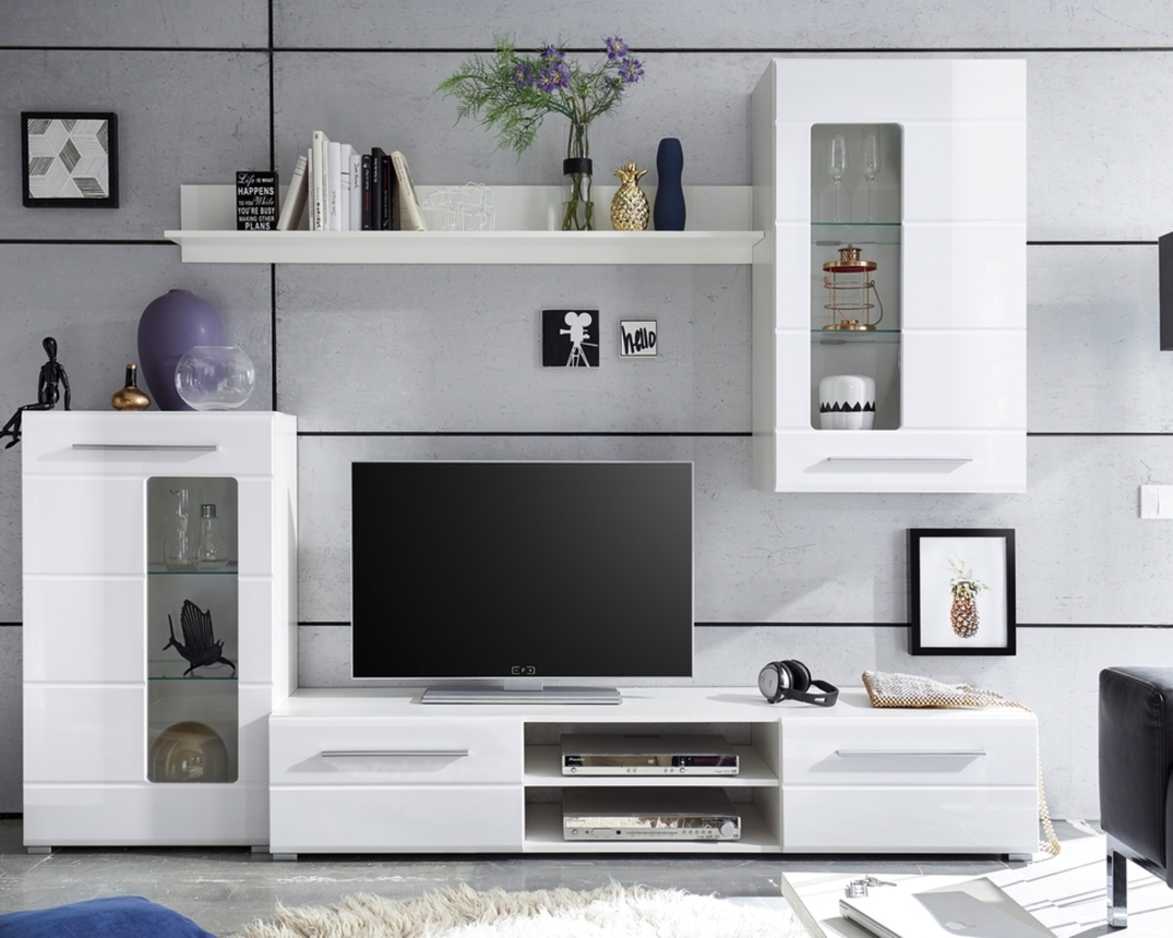 Moderne Anbauwand mit vielen Möglichkeiten und pfiffigen Detail. Durch die Front in weiß hochglanz und dem weißen Korpus passt sich diese Anbauwand in jedes Umfeld ein. Durch die moderne Zusammenstellung mit Lowboard ist auch für große Fernseher Platz. Zusätzliche Optik wird durch das Wandpaneel erreicht. Stauraum wird in den beiden Vitrinen geboten, und durch die Glaseinlage in der Front noch dazu optisch in Szene gesetzt.