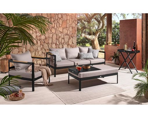 Mattschwarzes Tablett in L-Form aus Aluminium.
