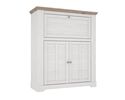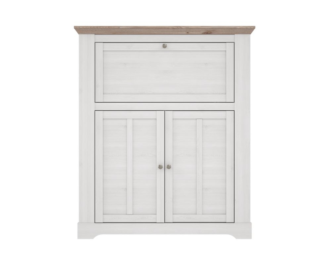 Die Barkommode "Fernanda" präsentiert sich im charmanten Landhausstil. Sie besteht aus zwei Türen und einer Klappe.