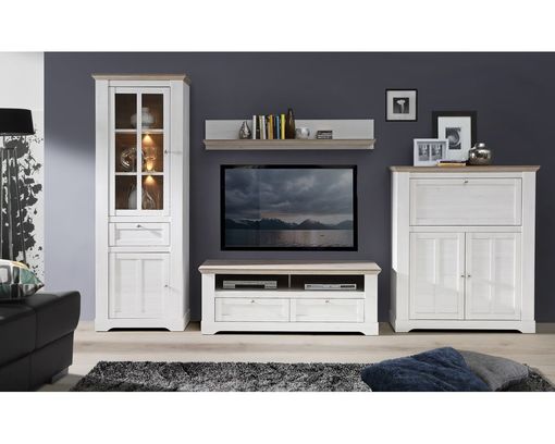Der TV-Unterschrank "Fernanda" präsentiert sich im charmanten Landhausstil. Er hat zwei Schubladen, in denen Sie einiges verstauen können sowie zwei offene Fächer.
