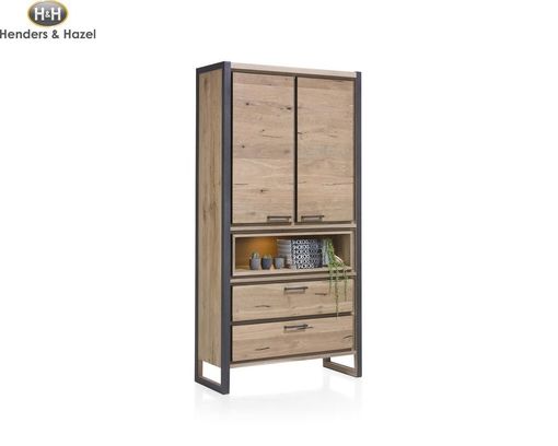 Dieser moderne Schrank bietet viel Stauraum mit zwei Türen, zwei Schubladen und einem Fach mit integrierter LED-Beleuchtung. Die Metallprofile um die Türen und Schubladen verleihen dem Schrank einen industriellen Look.