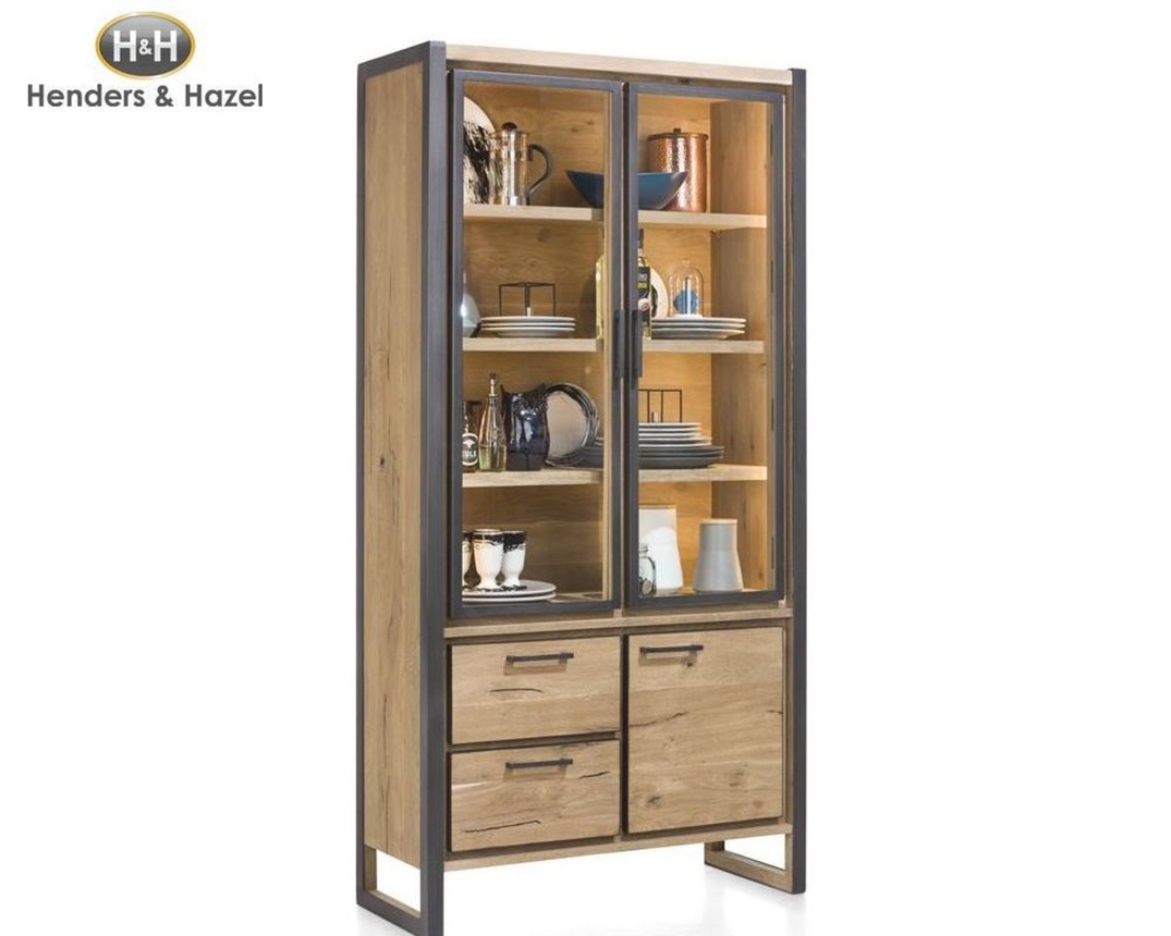 Die moderne Vitrine Metalo hat ein cooles Design mit einer Kombination aus Eichenfurnier und Metall. Ein schönes Detail ist, dass das Metall der Beine den Rest des Schrankes umschlingt. Hinter den Glastüren der Vitrine ist eine LED-Beleuchtung integriert, die eine schöne Beleuchtung verschafft - für alles, was Sie in dem Schrank ausstellen möchten.
