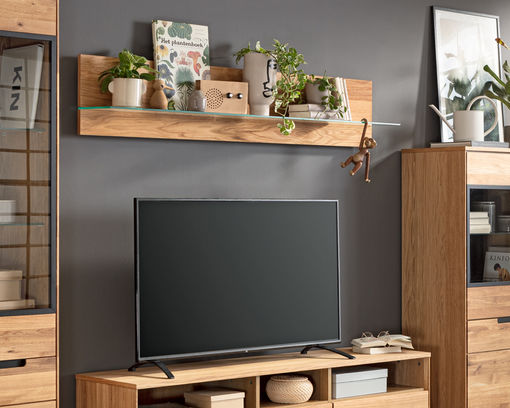 Elegantes Wandboard in Eiche teilmassiv geölt mit einer Abstellfläche aus Glas, welche Ihre Deko perfekt in Szene.