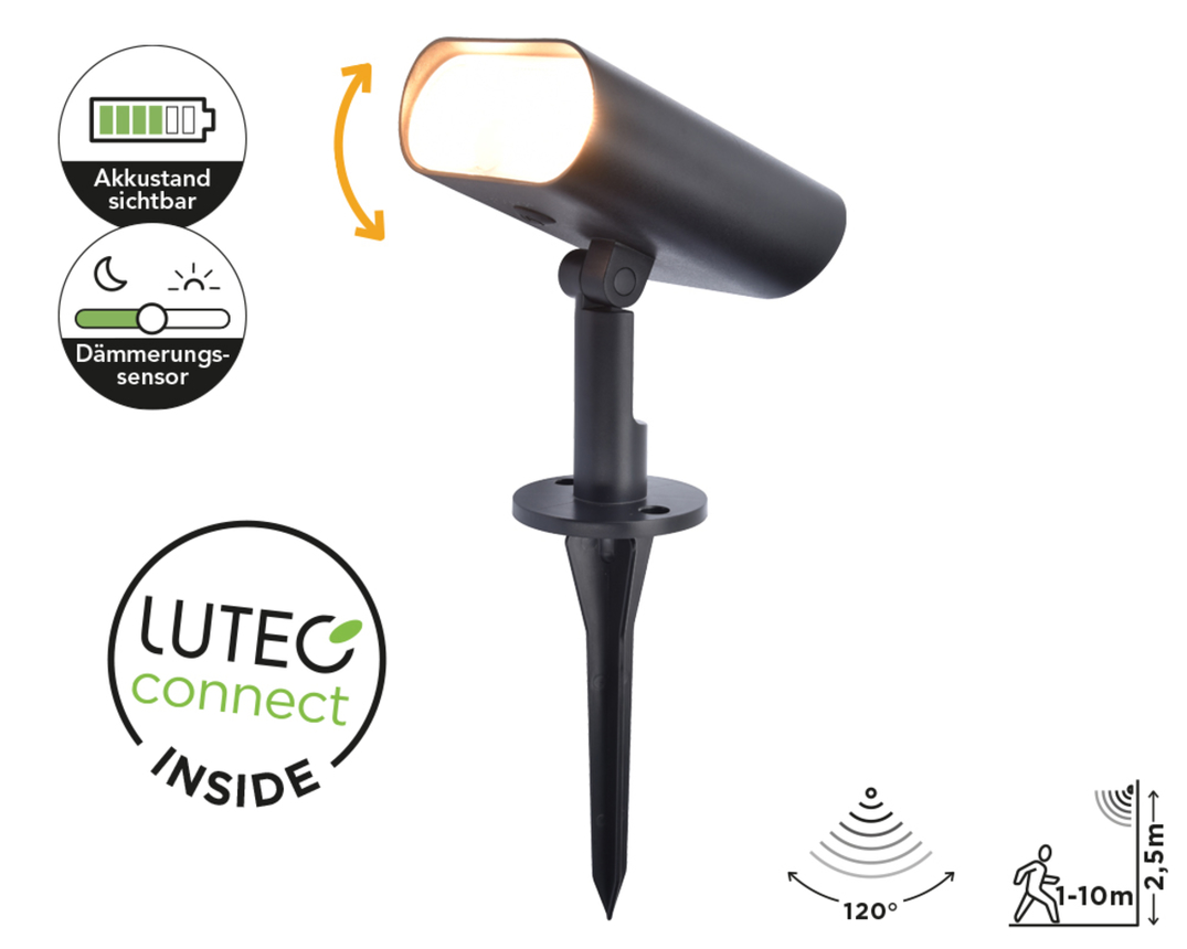 Smarte LED-Solarleuchte für Boden- oder Wandmontage mit optionalem Spieß. Dimmbar und steuerbar via App.