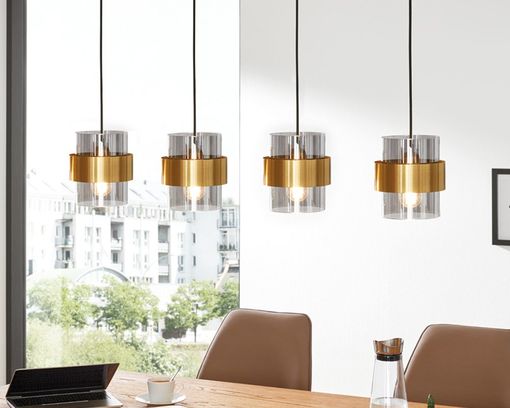 Ein moderner Hingucker ist diese Pendelleuchte aus der Interliving Leuchtenserie 9333. Sie vereint mehrere Materialien gekonnt miteinander: Schwarzes Metall, einen Messingring und rauchfarbenes Glas.
