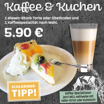 Oder ihr genießt einen Kaffee (wahlweise mit Hafer-Drink oder Kuhmilch) mit einem riesen Stück Torte oder Kuchen von unserem großen Kuchenbuffet.